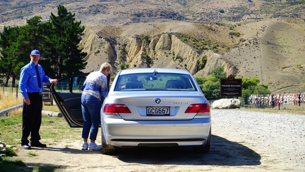 Seejärel peatusime Wanaka linnas ja tankisime linnast läbi jooksvas külma vee allikas oma veekanistrid. Sõitsime läbi vana tuttava Cardrona veinipiirkonna Queenstowni suunas. Rinnahoidjate näituse ja väljapaneku juures tegime pilti ühest VIPist paarikesest, kes oli tellinud endale personaalse tuuri luksusautoga BMW 730. Auto oli loomulikult varustatud ka turvamees-juhiga ehk ka niimoodi on võimalik seda “ebaturvalist” maad avastada. 🙂