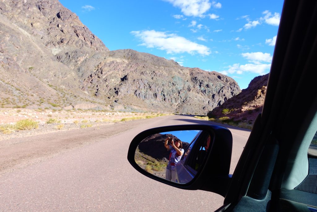 Jätkasime teekonda Argentiina rahvusparkide suunas. Vasakul ja paremal haigutas üks suur kõrb kümneid kilomeetreid, kus puudus asustus ja kus midagi kultuurset ei kasvanud ning looduslikud põõsad olid kohastunud vastavalt kõrbeoludega. Üks vaene hobune nägi ühe talu lähistel õige nälginud välja. Veega ja rohelusega on ju kõrbemaastikul kitsad lood… Hõredat liiklust nähes kujutlesime, kui kerge on veevarudeta siin tee ääres janusse surra ja olime tänulikud, et igal pildistamispeatusel ootas meid kannatlikult jahe külmkapp, õues oli ju 35+ kraadi. Ainsad kaaslased sel pikal kõrbeteekonnal olid jumal-teab-kust õhku kerkivad liivasambad, mis sama äkki kahanesid ja kasvasid. Kui selline pisike tuulepüks sattus meie möödumisel samaaegselt autoteed ületama, oli kerge raputus külgtuule näol täitsa tuntav.